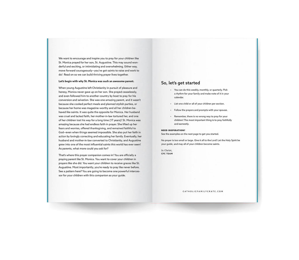 Our undated prayer journal can be started at any time and makes a great gift. This journal is inspired by St. Monica and includes her inspiring story of how praying for your children is the most important thing we can do as parents. You can use this one journal for multiple children or keep a journal per child! The perfect size to tuck into your Bible or purse!