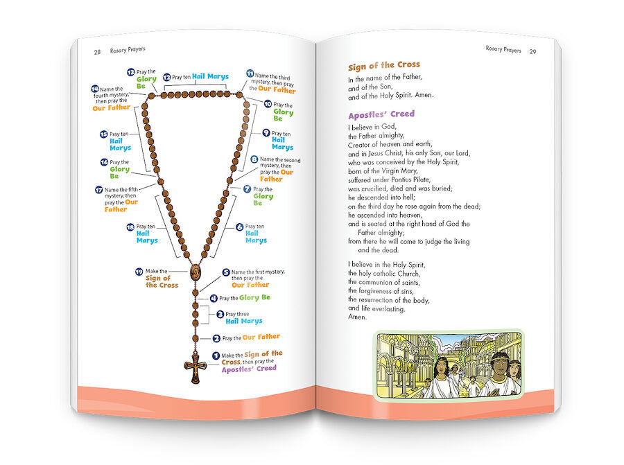 Children will love how this beautifully illustrated keepsake guides them in learning the order and prayers of the Mass, everyday prayers, prayers of the Rosary, prayers for the liturgical seasons, family prayers, and prayers for special times using Bible passages.