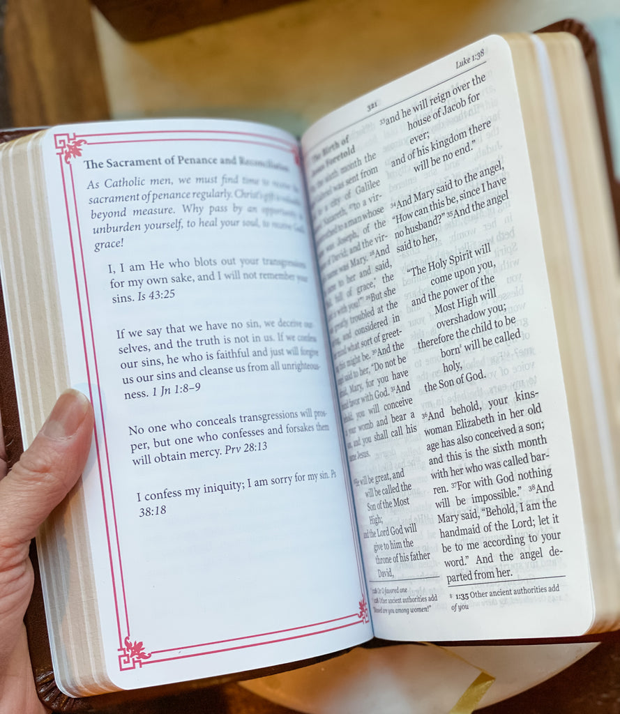 In addition to the New Testament and Psalms, special inserts containing prayers, writings from the saints, and more dot the interior, offering even more tools for men trying to live a Christ-like life.