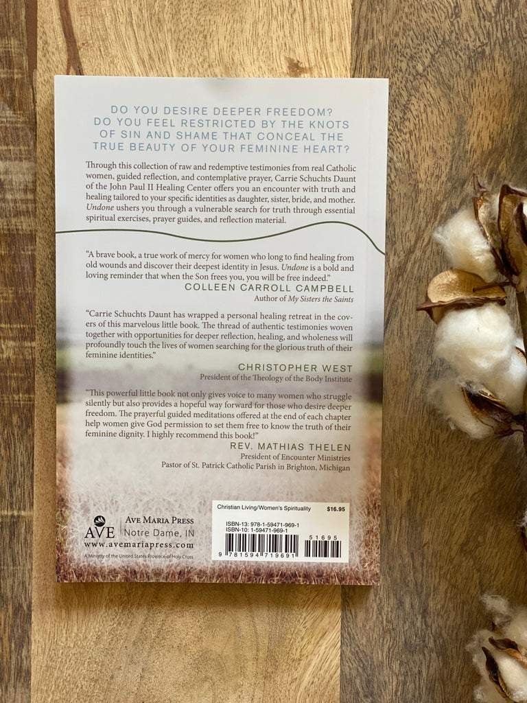 Through this collection of raw and redemptive testimonies from real Catholic women, punctuated with guided reflection and contemplative prayer, Carrie Schuchts Daunt of the John Paul II Healing Center offers you an encounter with truth and healing tailored to your specific identities as daughter, sister, bride and mother. Undone ushers you through a vulnerable search for truth through essential spiritual exercises, prayer guides, and reflection material.