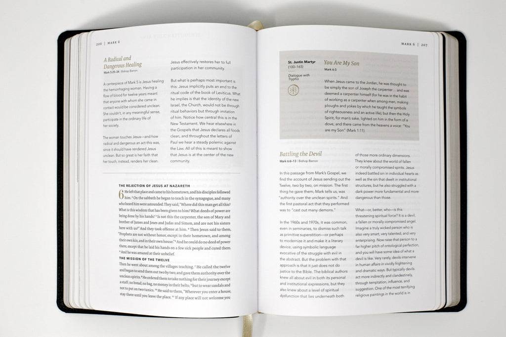 All five volumes are surrounded by illuminating artwork and helpful commentary from Bishop Robert Barron, the Church Fathers, and some of the greatest saints, mystics, artists, and scholars throughout history, allowing the story of Jesus Christ to shine with new clarity. You'll discover insights from John Chrysostom, Augustine, Thomas Aquinas, John Henry Newman, G.K. Chesterton, Thérèse of Lisieux, Fulton Sheen, John Paul II, Origen, Teresa of Kolkata, Thomas Merton, Jerome, Hans Urs von Balthasar, Francis de Sales, Teresa of Avila, John of the Cross, Peter Kreeft, Sally Read, Katie Prejean McGrady, Richard DeClue, and many other teachers in the way of the Spirit.