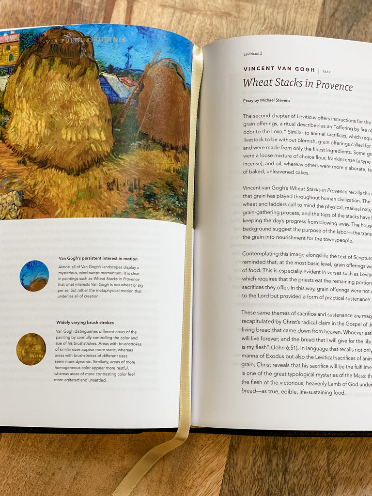 Leather Bound or Hardcover Binding: Smyth-sewn binding, which allows for it to lie flat when open, printed and bound in Italy, German top-grain leather, ribbon marker, metallic gold ink accents on the cover and sides, full-color artwork, custom Angelico font.