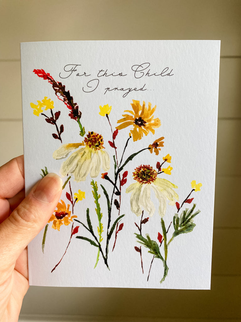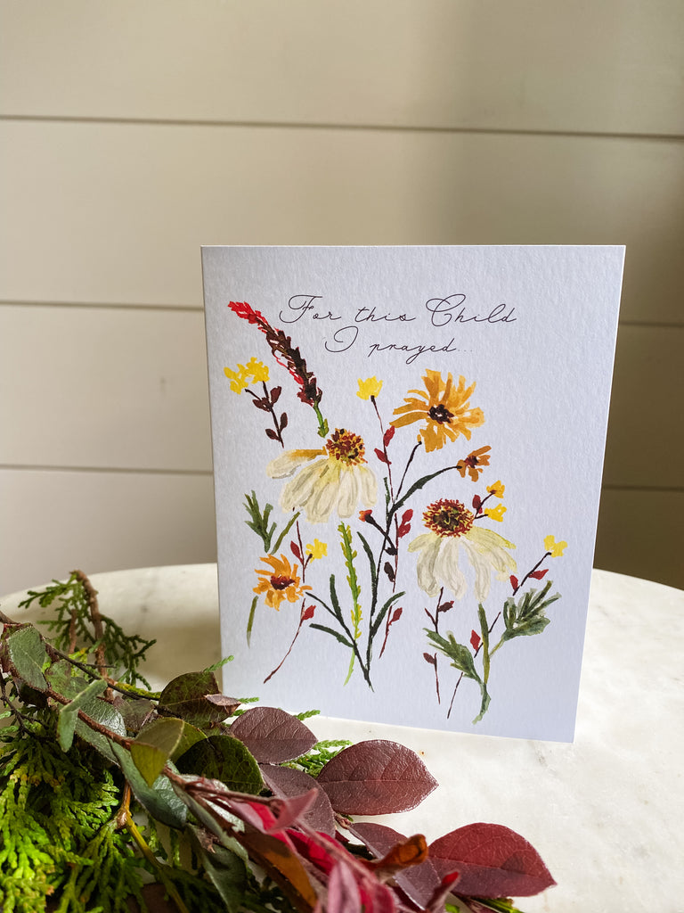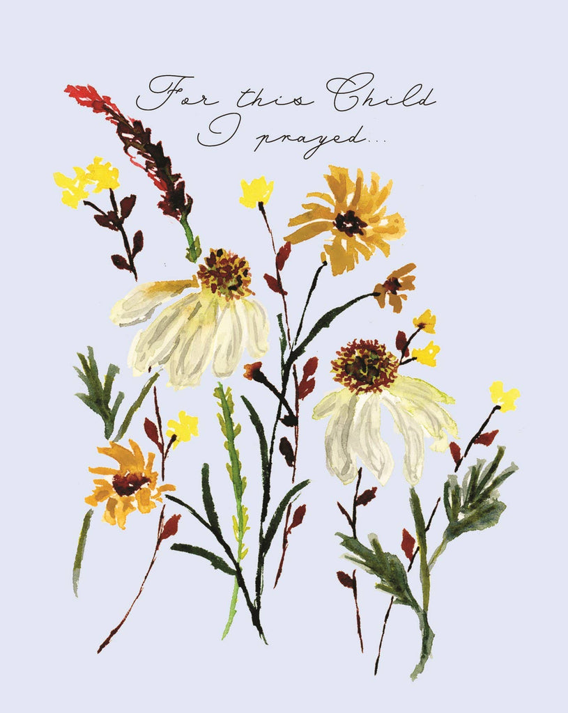 A beautiful floral greeting card to celebrate the gift of a new child. "For this child I prayed."