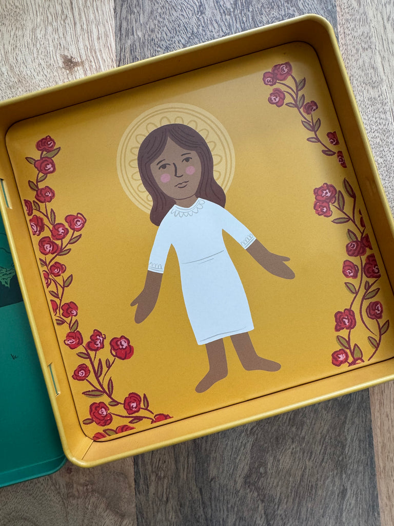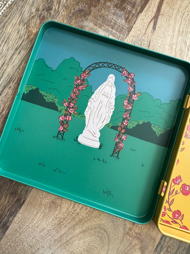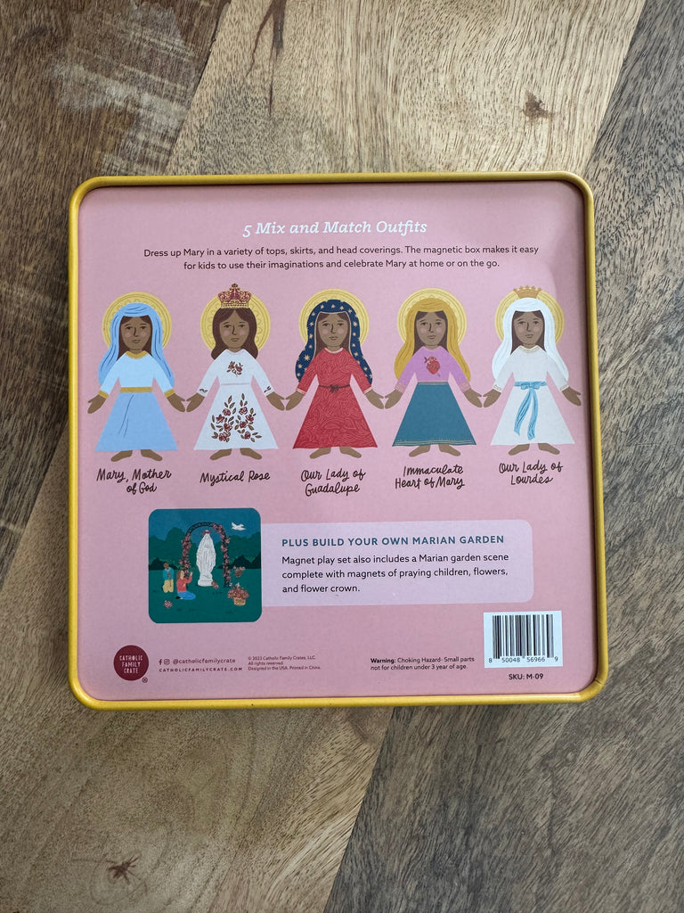 The other side of the magnetic tin features a Marian garden with magnets to build your very own Marian garden!