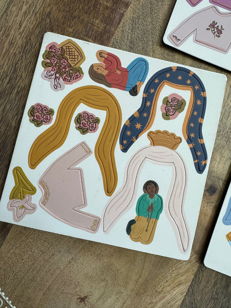 Delight your little ones with the enchanting Mary Dress Up & Prayer Garden Magnet Playset, a perfect gift to help foster a devotion to the Blessed Mother. Packed with 28 magnetic pieces, this set is designed to foster a relationship with Mary in a delightful and interactive way.