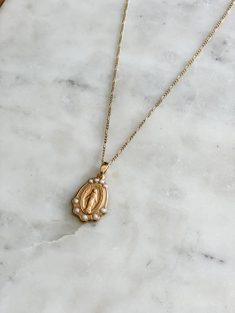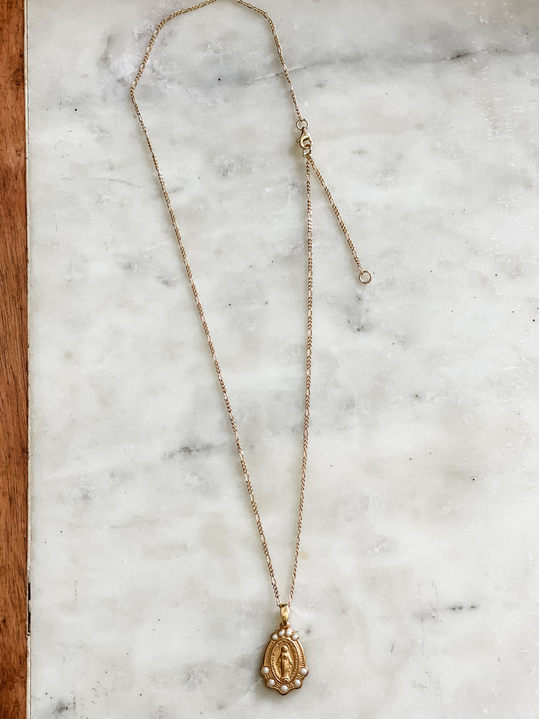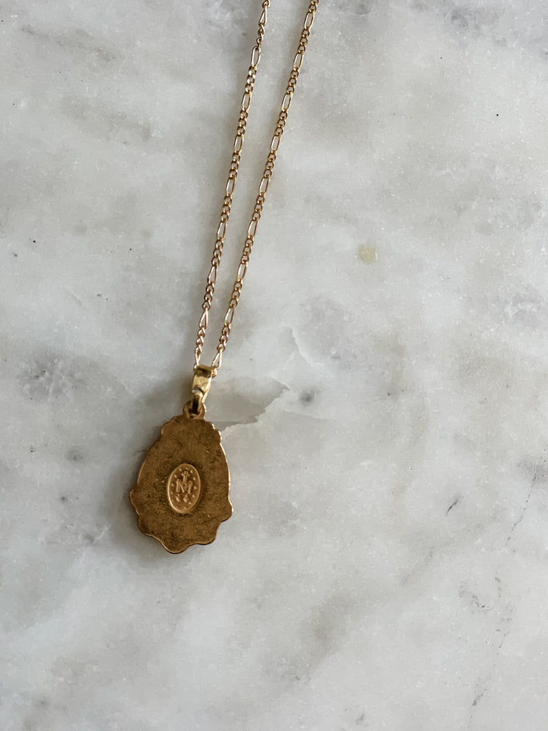 This stunning Miraculous Medal necklace is sure to become a cherished heirloom for years to come! The front of the medal features the image of the traditional Miraculous Mary, wreathed with tiny enamel "pearls". On the back, the traditional Miraculous Medal backing is stamped. This necklace was lovingly created using a vintage mold found in a New England jewelry shop. We just adore its timeless and truly classic look!
