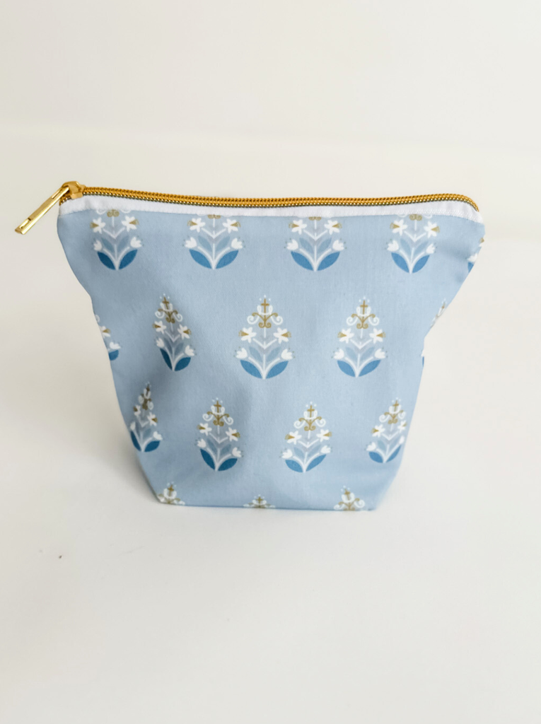 Adorned with an enchanting all-over print of our unique Marian symbol against a serene light blue background, this cosmetic bag exudes elegance and charm. The symbol itself is a masterpiece of meaning, blending the delicate Lily flower, a timeless representation of Mary's purity, with our distinctive interpretation of the Marian monogram.