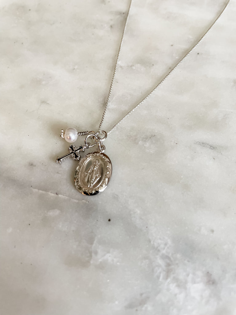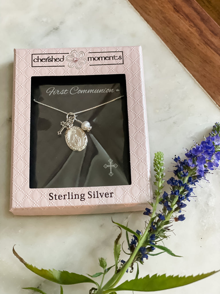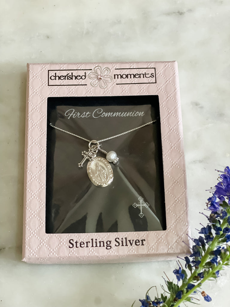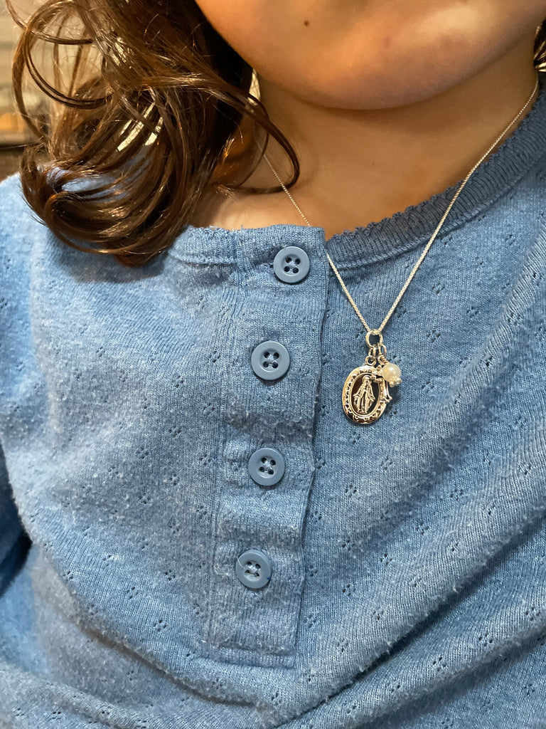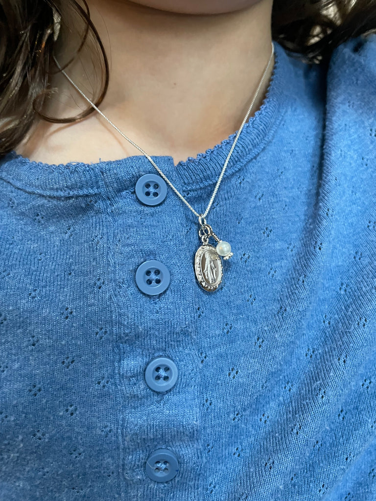 This beautiful Sterling Silver First Communion Gift with "Miraculous Medal" necklace is accented with a dainty cross charm and pearl charm. It floats on a 14" sterling silver Italian chain.