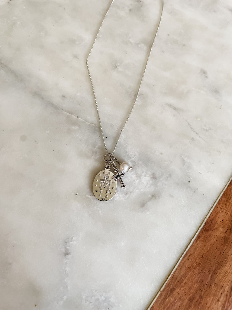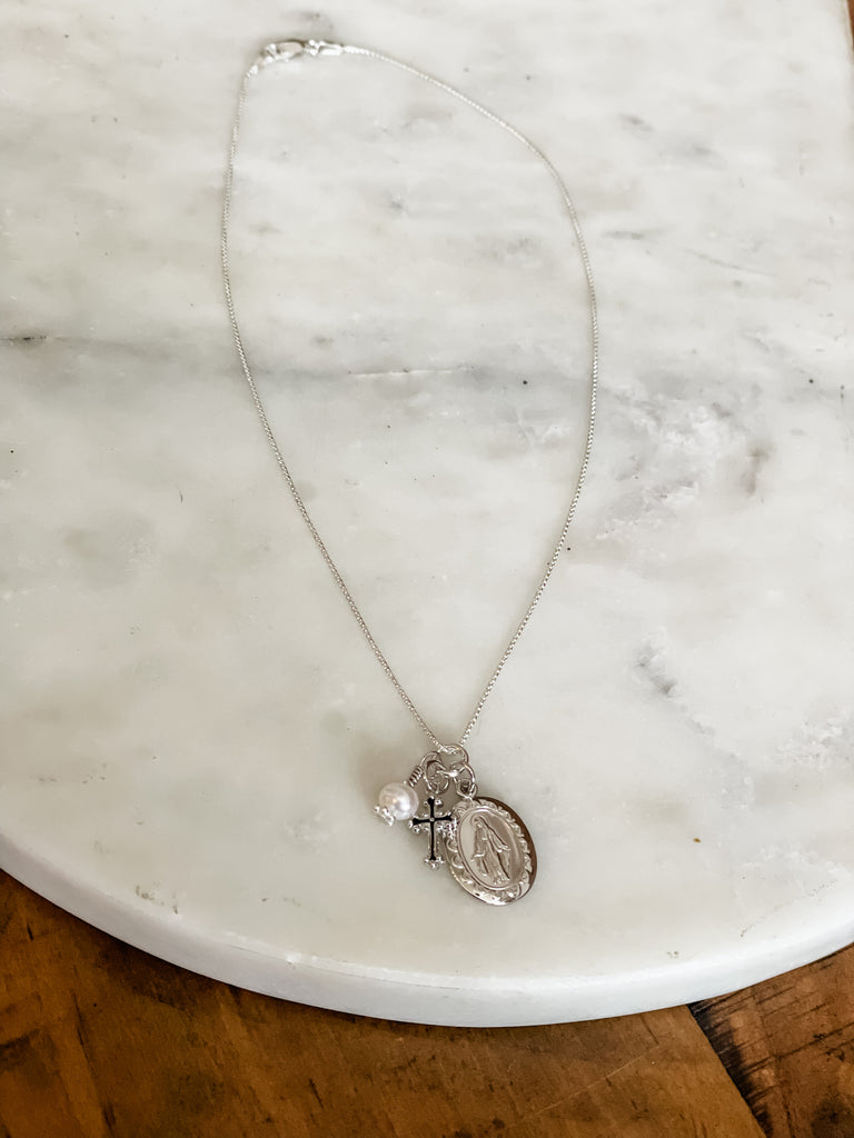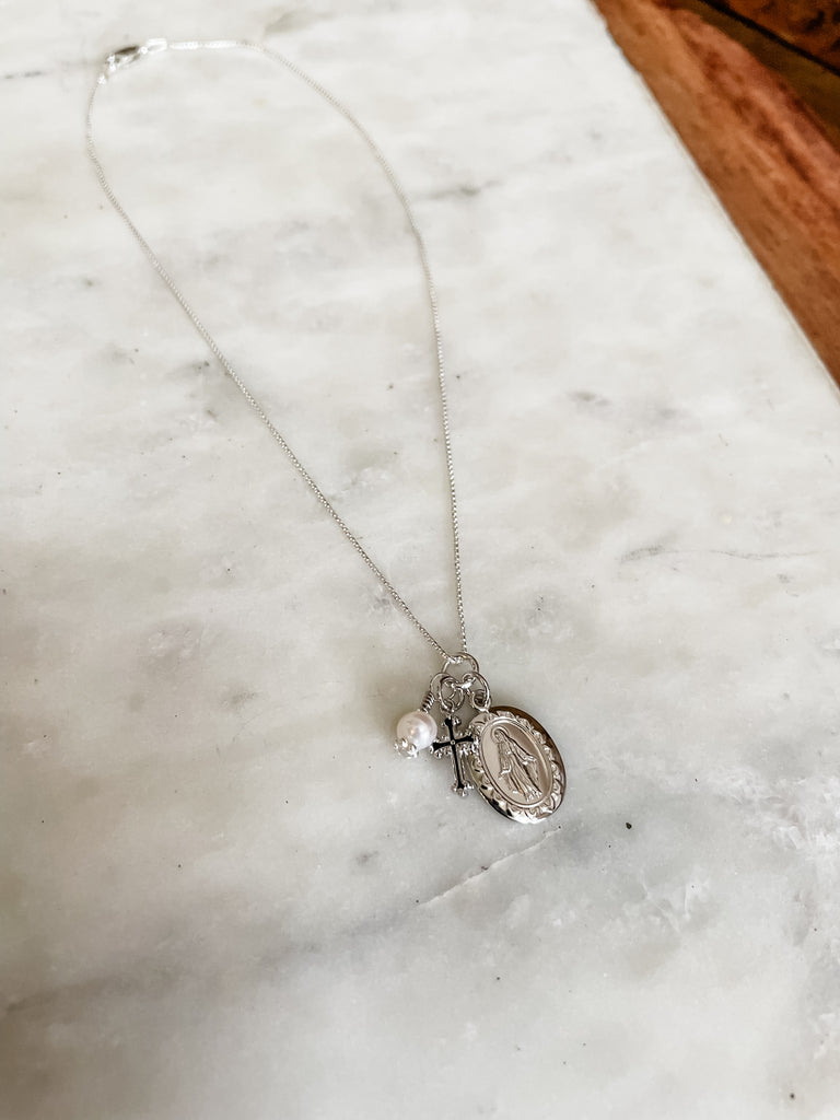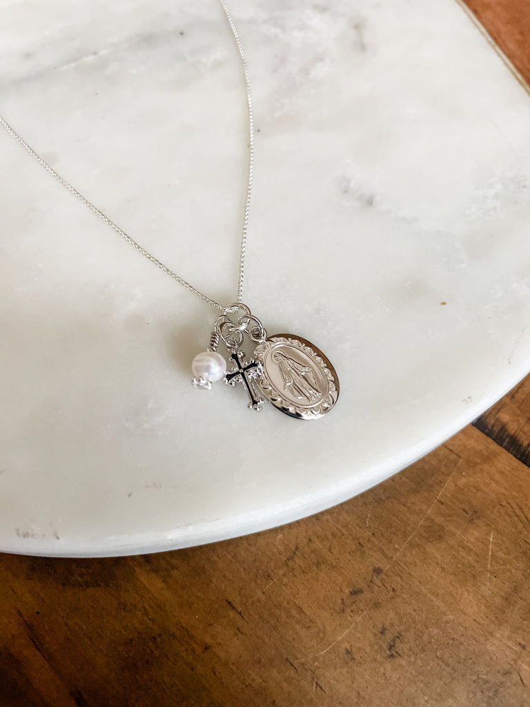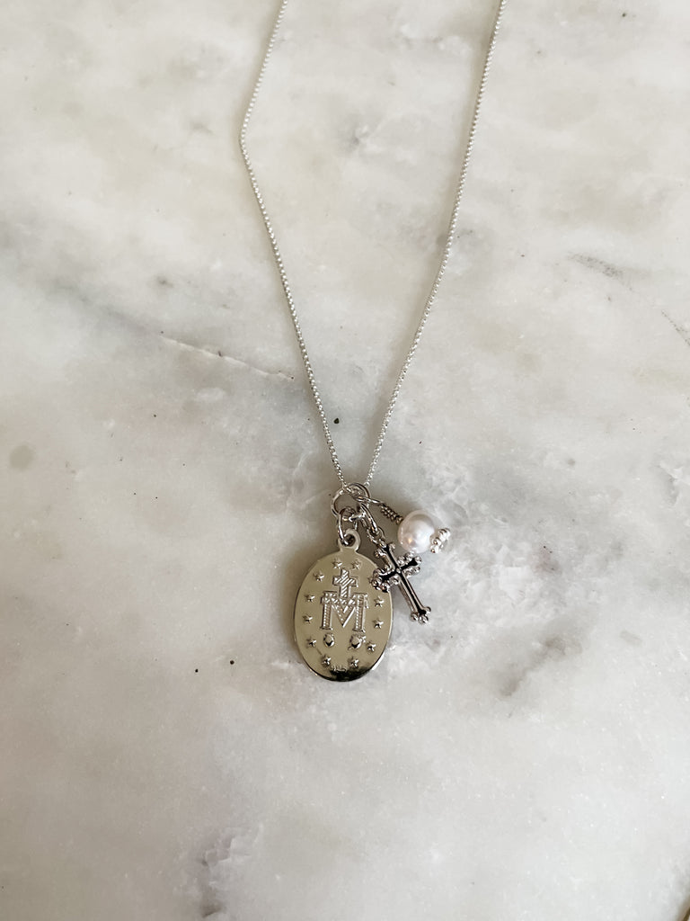 This beautiful Sterling Silver First Communion Gift with "Miraculous Medal" necklace is accented with a dainty cross charm and pearl charm. It floats on a 14" sterling silver Italian chain.