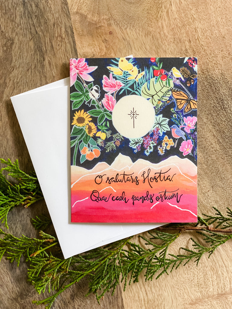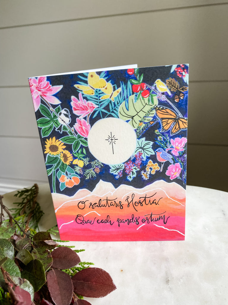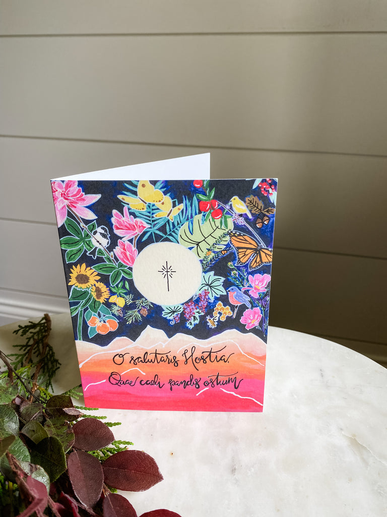 A beautiful floral greeting card emphasizing the beauty of the Eucharist that is suitable for many different occasions, especially sacramental celebrations.