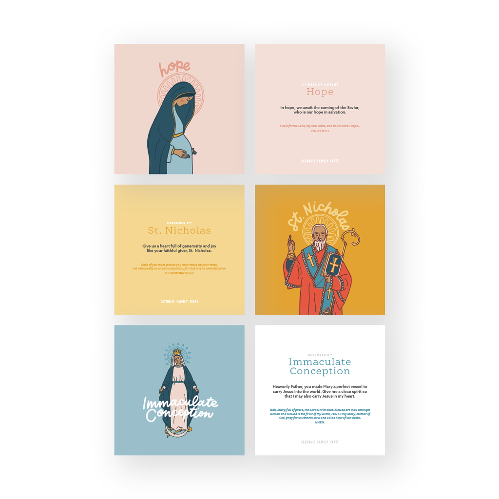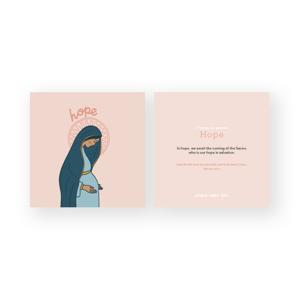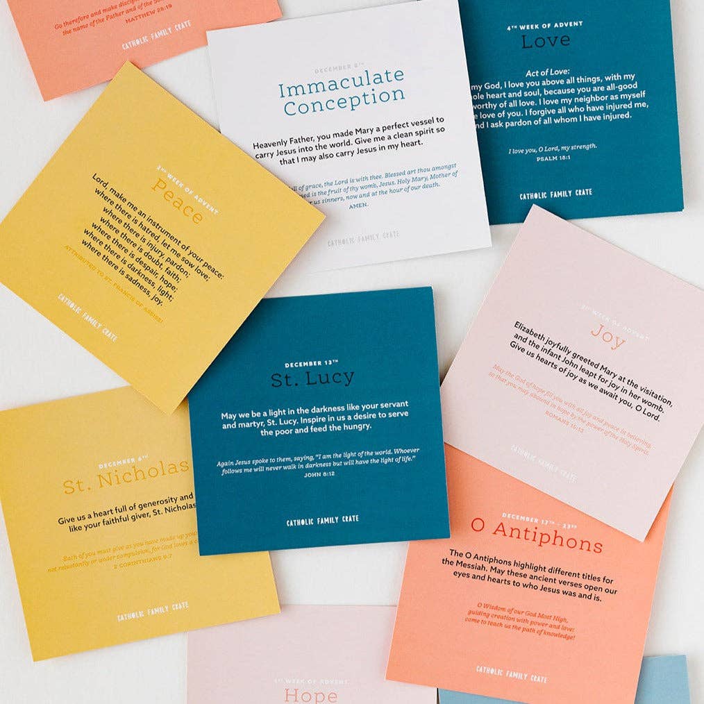 10 Different Hand Illustrated Images that are simply gorgeous. Backs of each card include meditations, Scripture, and prayer to share as a family. * 1st Week of Advent (hope) * St. Nicholas * Immaculate Conception * Our Lady of Guadalupe * St. Lucy * 2nd Week of Advent (peace) * Gaudete Sunday * 3rd Week of Advent (joy) * O Antiphons * 4th Week of Advent (love) * Decorate your home in a way that points hearts to Christ * Stay on track with the many important feast days * Build anticipation by taking you through the journey of this exciting season They are undated to enjoy year after year.