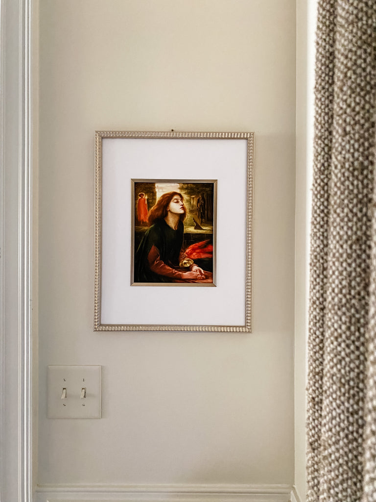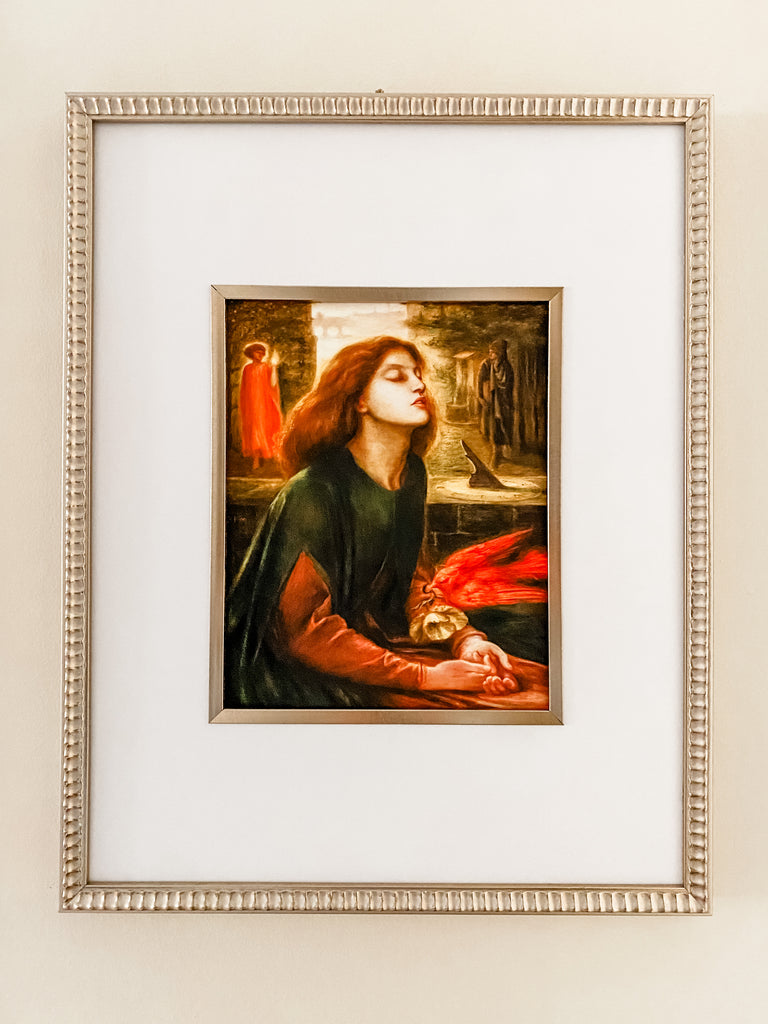 Beata Beatrix would make a beautiful addition to your home, most especially in a personal prayer space, to remind us of the posture of openness we should strive for in prayer. I also love giving her as a gift to young women on their Confirmation or to those newly initiated into the faith in adulthood.