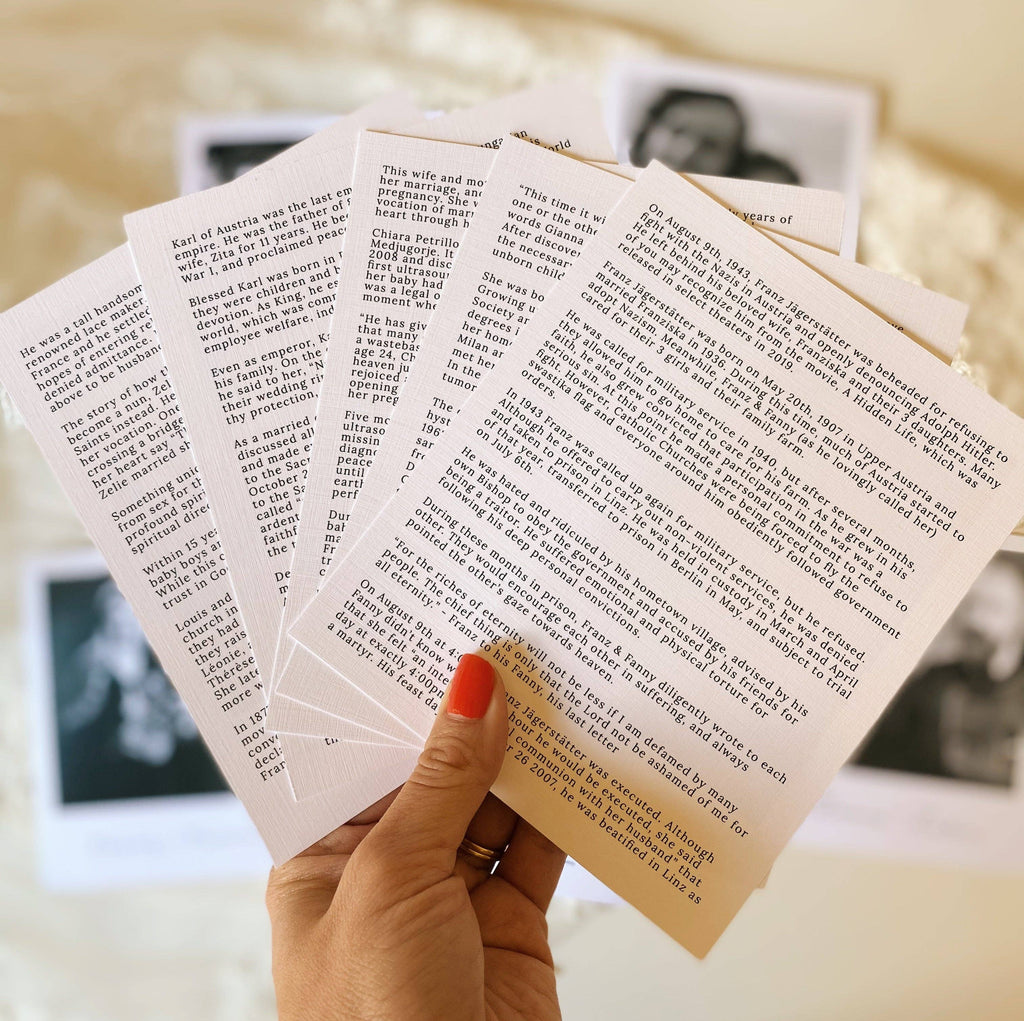 Each photo is printed on 5 x 6 inch 100 lb linen paper + handwritten calligraphy. This pack was created to encourage engaged and married couples in their vocation to sainthood with their beloved.