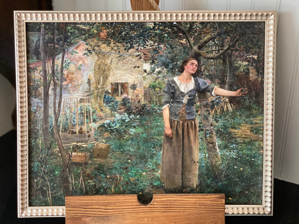 St. Joan of Arc was painted by Jules Bastien-Lepage in 1879. It is an oil painting of massive scale depicting the moment of her deeply spiritual encounter where she heard the voices of Saints Catherine of Alexandria, Margaret the Virgin and the Archangel Michael urging her to lead the French into battle against the English. This momentous vision forever changed the course of both her history (as a then young 13 year old girl) as well as France's history.