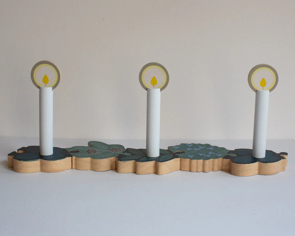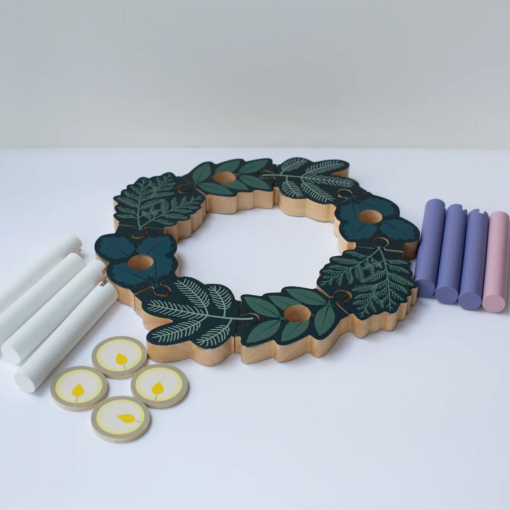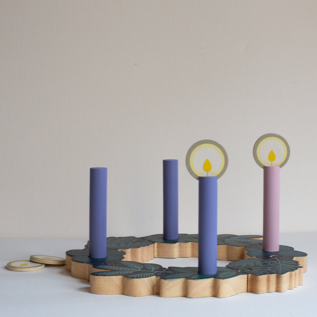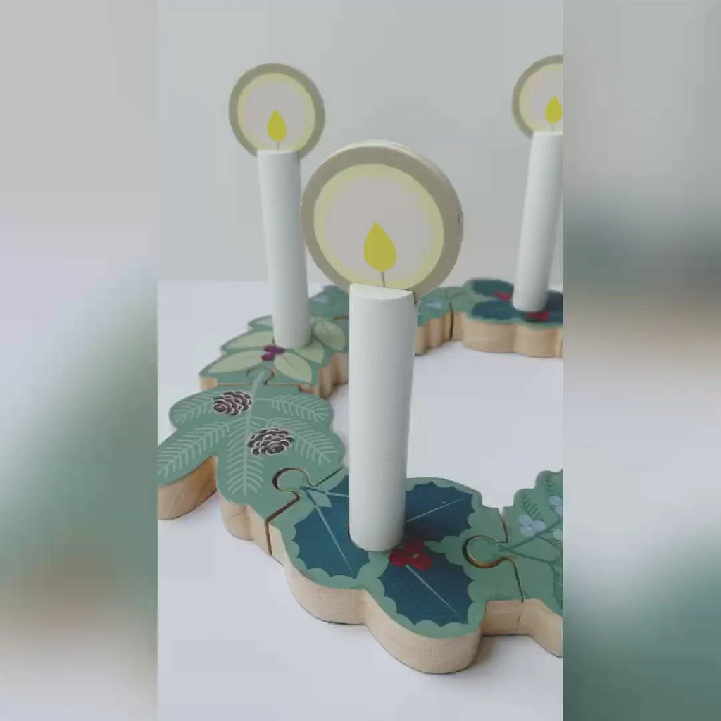 20 piece set includes: 8 double-sided interlocking wreath puzzle bricks; 3 purple candles, 1 rose candle, 4 white candles, 4 "flame" disks.