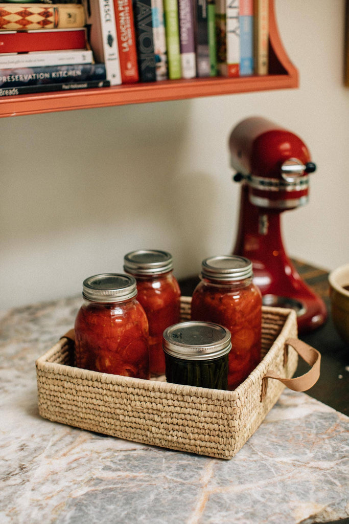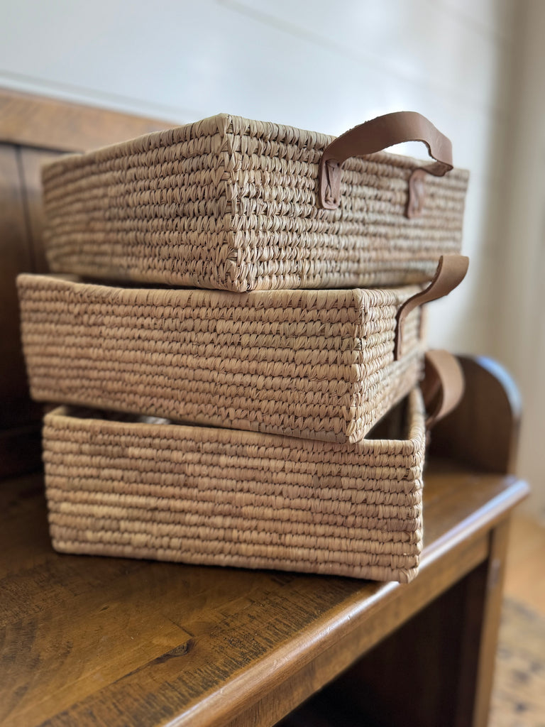 Details: Date palm leaves and leather - Wipe with damp cloth - Overall: 10.25W x 10.25L x 3.75H inches; Internal dimensions: 9.75L x 9.75W x 3.25H inches; Handles: approximately 10.25L (end to end) x 7.5L (not including leather tab portions sewn to basket) x 0.75W inches - Two tan leather handles attached to the sides of the basket (one on each side) - Handcrafted in Bangladesh