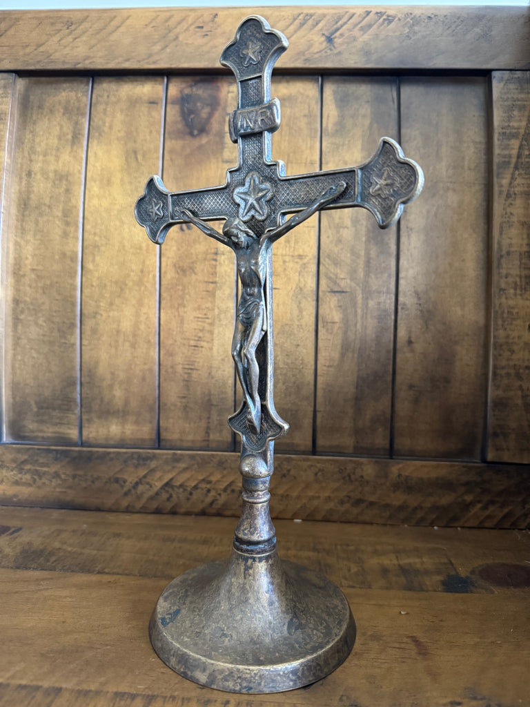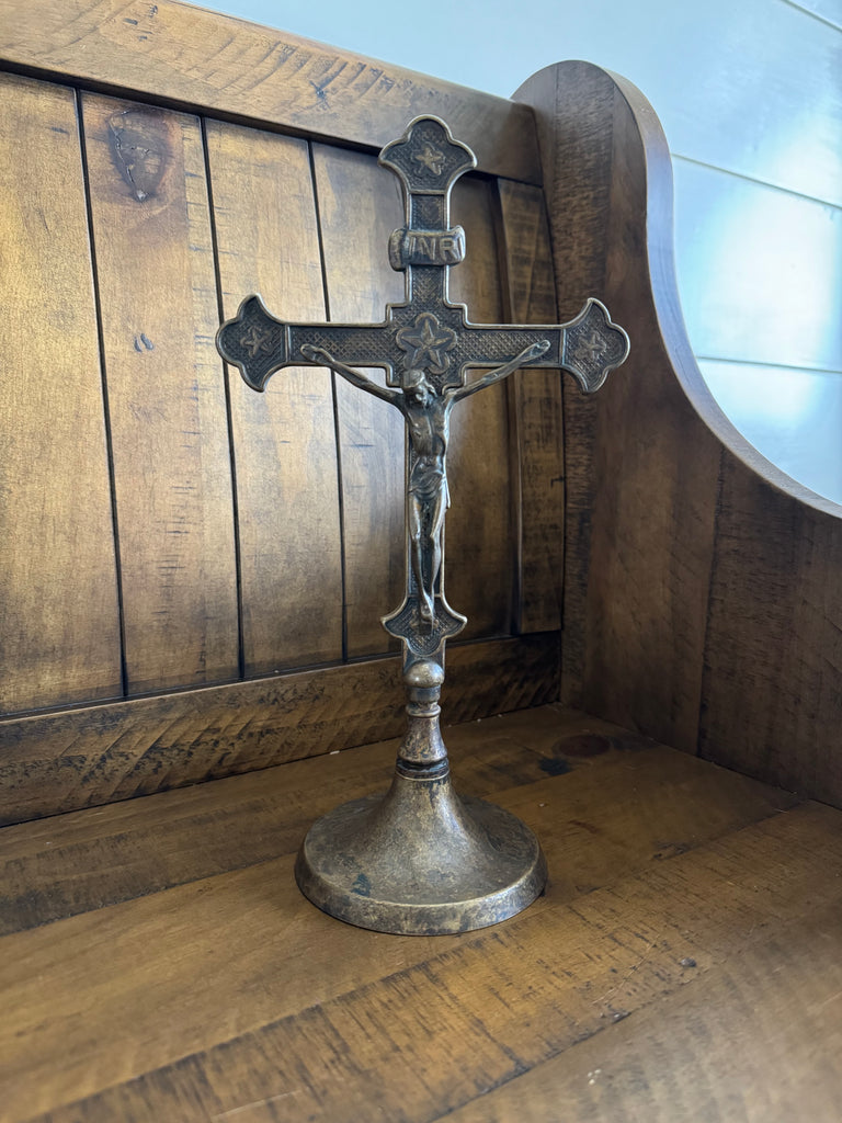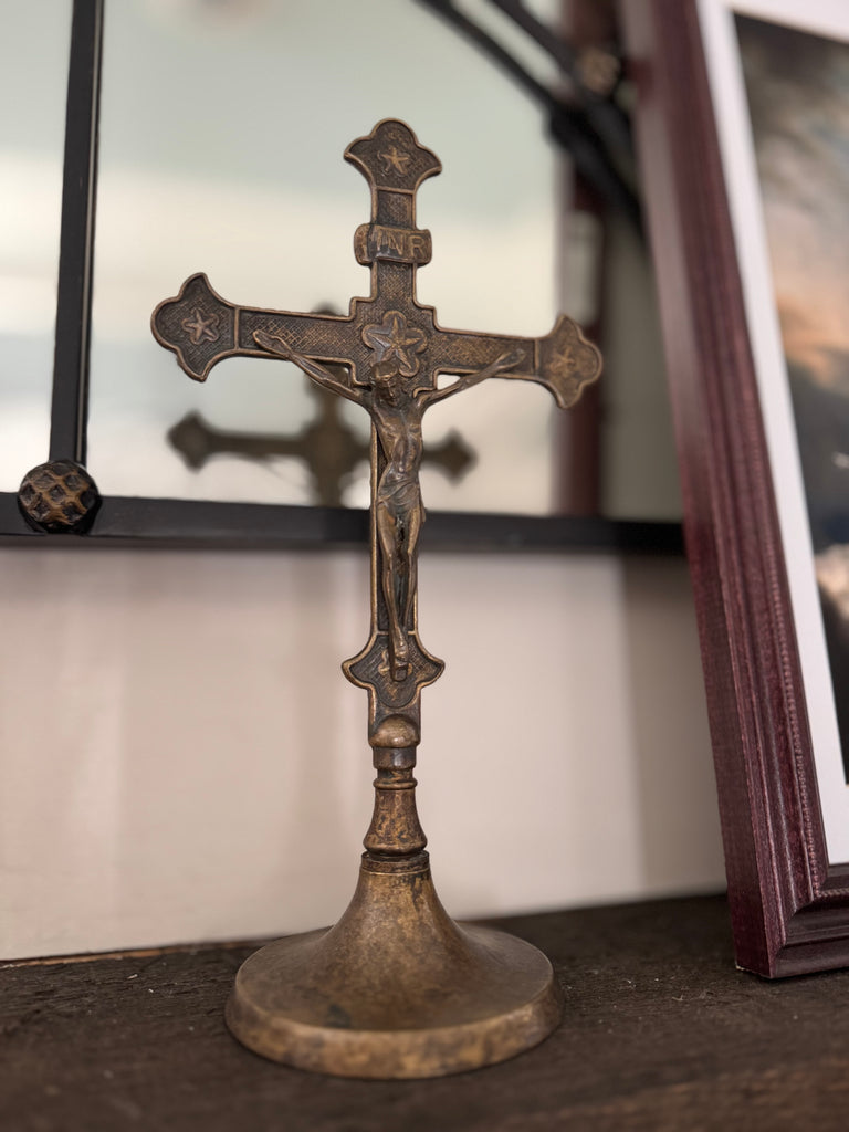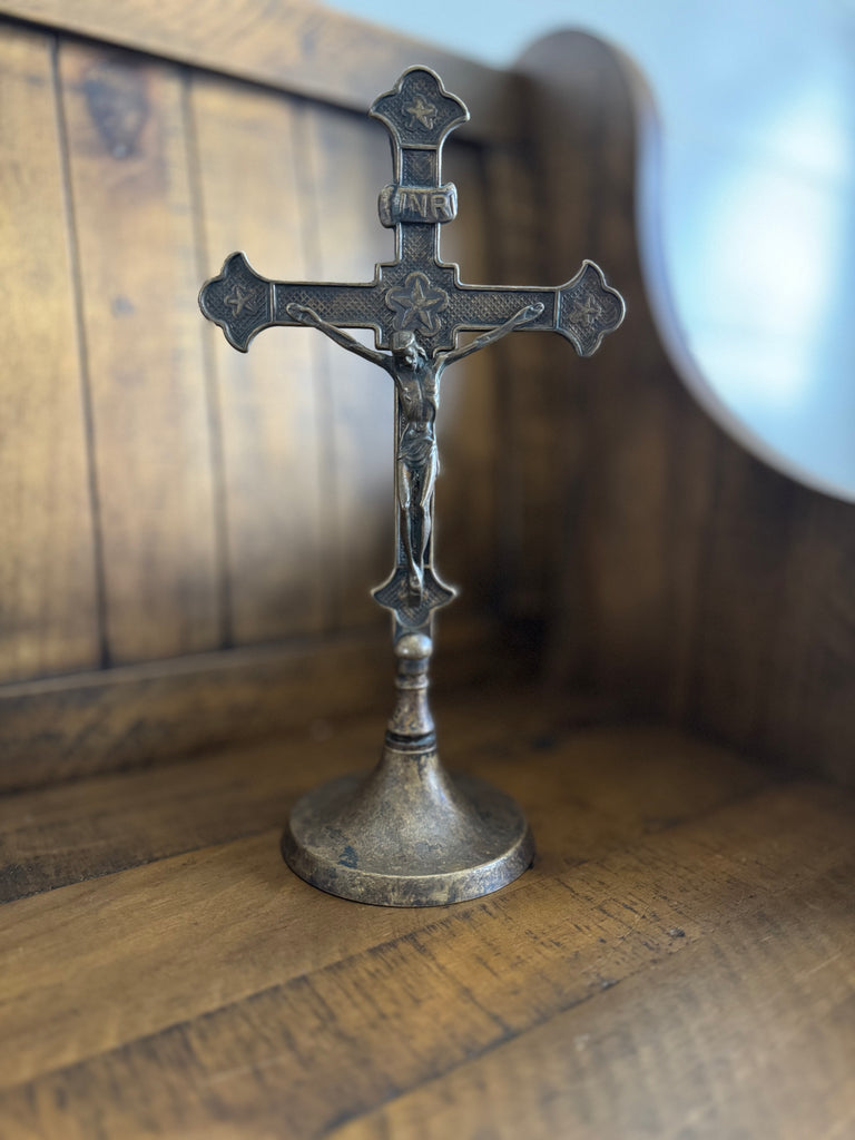 This exquisite standing crucifix in antiqued brass is truly special! Its traditional aesthetic is a beautiful testament to the enduring beauty and rich history of our faith. The materials and detailed work of this crucifix are a foretaste of the glorified state to come of Christ's body. This standing crucifix is the perfect gift for a priest or anyone who appreciates the timeless beauty of the Catholic faith. It would also make a lovely addition to your personal place of prayer, or home altar. It is made in Italy in the timeless tradition. Elevate your prayer space or home with this exquisite piece of art.