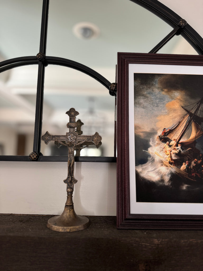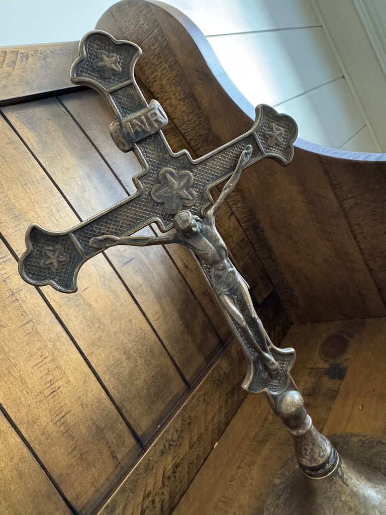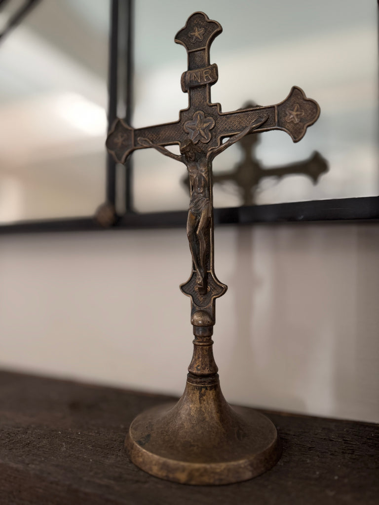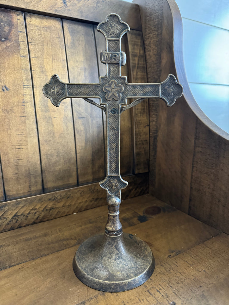 This exquisite standing crucifix in antiqued brass is truly special! Its traditional aesthetic is a beautiful testament to the enduring beauty and rich history of our faith. The materials and detailed work of this crucifix are a foretaste of the glorified state to come of Christ's body. This standing crucifix is the perfect gift for a priest or anyone who appreciates the timeless beauty of the Catholic faith. It would also make a lovely addition to your personal place of prayer, or home altar. It is made in Italy in the timeless tradition. Elevate your prayer space or home with this exquisite piece of art.