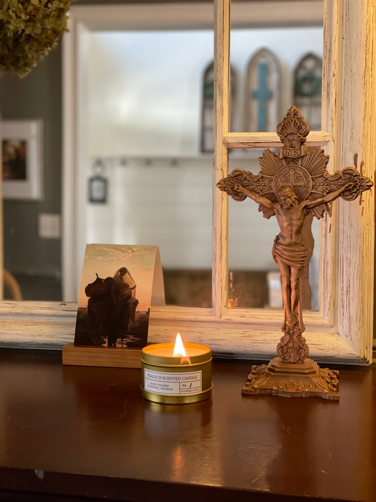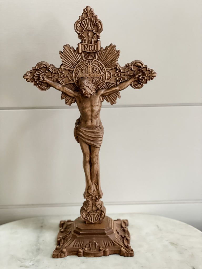 This standing version of our beautiful wooden crucifix is carved from solid alder wood and sure to make a beautiful impact in your home. It would make a beautiful addition to a fireplace mantle, a dresser or a bookshelf. Our personal favorite place to display this crucifix, however, would be in your dedicated prayer space, or an Home Altar. Each crucifix is carved in Ukraine and sanded and varnished by hand. As such, there will be slight variations from one to the next.