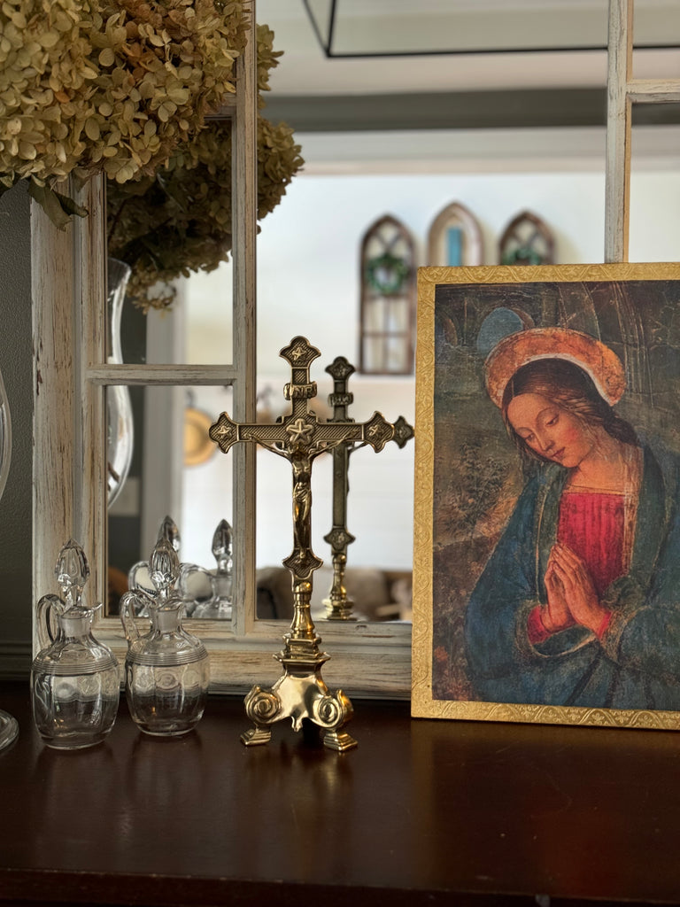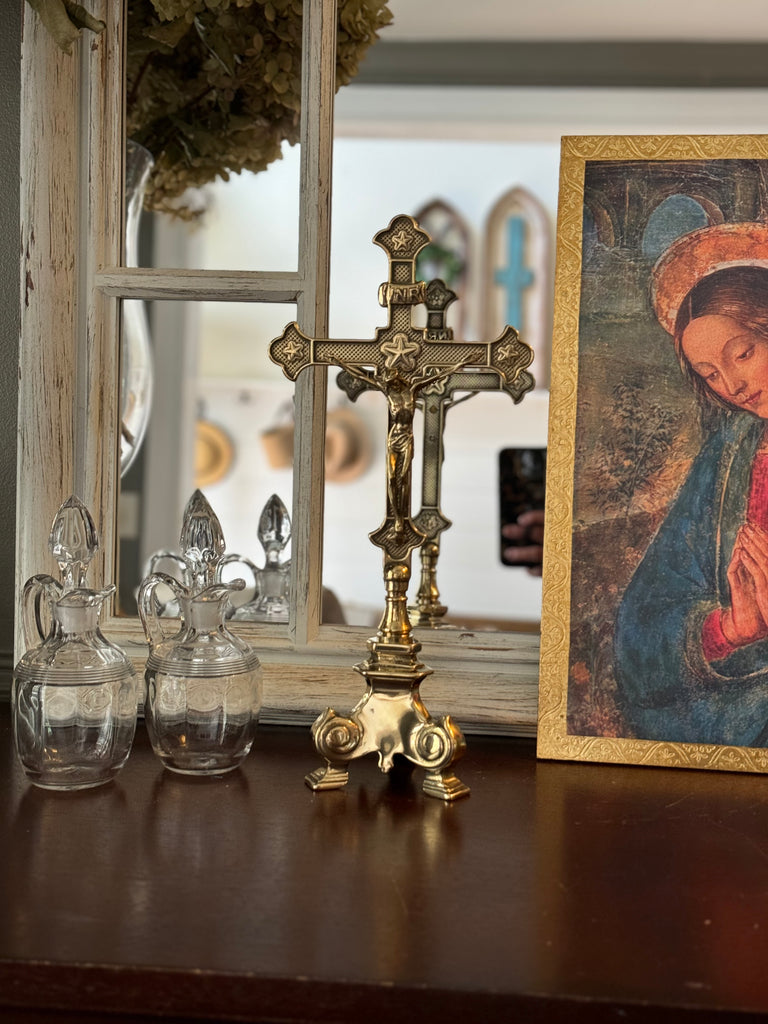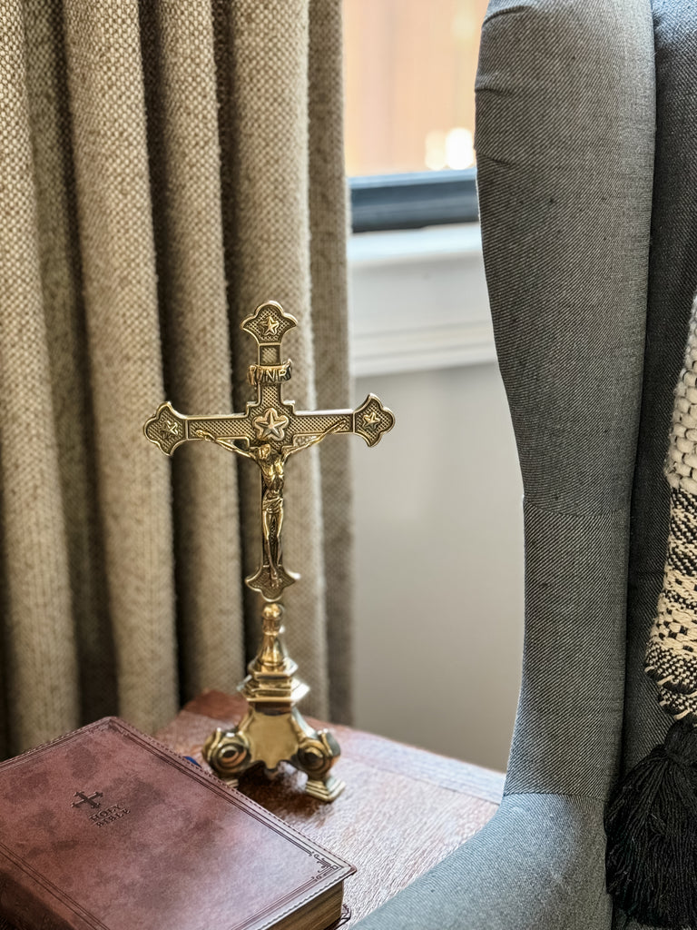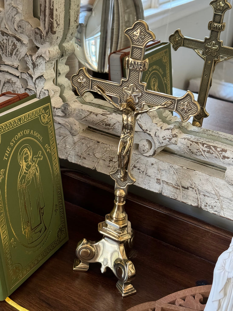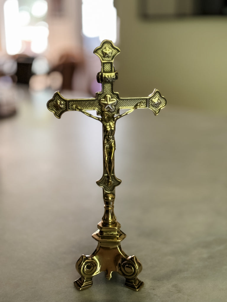 This exquisite standing crucifix in polished brass with burnished accents is truly special! Its traditional aesthetic is a beautiful testament to the enduring beauty and rich history of our faith. The materials and detailed work of this crucifix are a foretaste of the glorified state to come of Christ's body. This standing crucifix is the perfect gift for a priest or anyone who appreciates the timeless beauty of the Catholic faith. It would also make a lovely addition to your personal place of prayer, or home altar. It is made in Italy in the timeless tradition. Elevate your prayer space or home with this exquisite piece of art.
