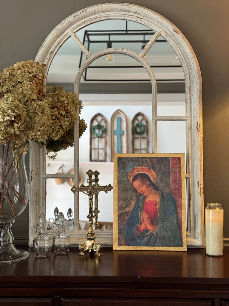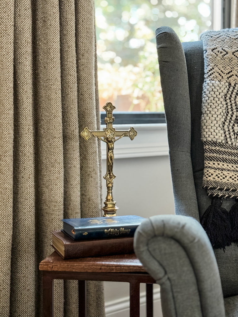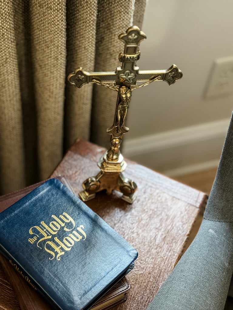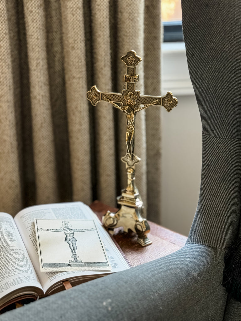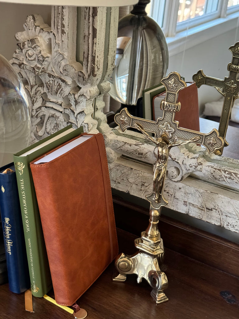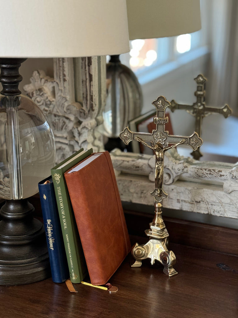 This exquisite standing crucifix in polished brass with burnished accents is truly special! Its traditional aesthetic is a beautiful testament to the enduring beauty and rich history of our faith. The materials and detailed work of this crucifix are a foretaste of the glorified state to come of Christ's body. This standing crucifix is the perfect gift for a priest or anyone who appreciates the timeless beauty of the Catholic faith. It would also make a lovely addition to your personal place of prayer, or home altar. It is made in Italy in the timeless tradition. Elevate your prayer space or home with this exquisite piece of art.